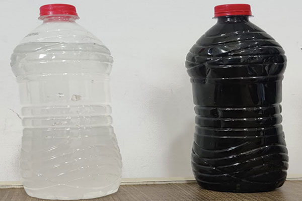 First bottle is treated spill and wash water from an oil refinery without any Oil, solvent or impurities, which can be reused. The second bottle is the waste untreated water. The remaining residue is oil and sludge where the oil can be removed by separation technology and sludge can be sent to Land filling site.